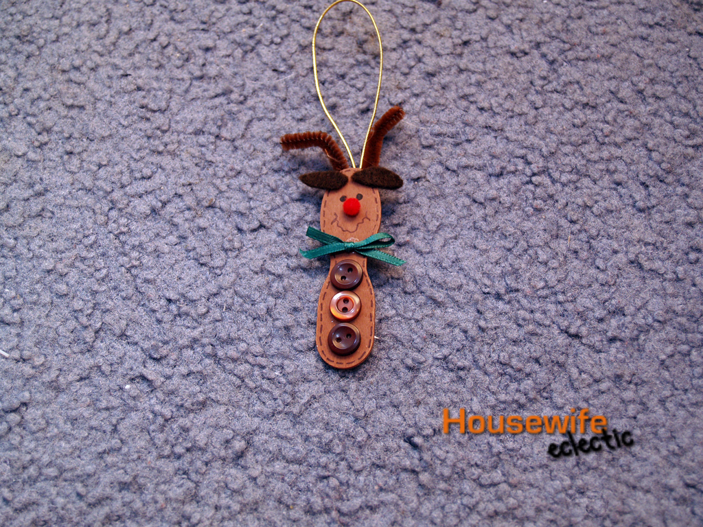 Paint your little spoon, brown. When it is dried, tie a little bow with your ribbon and glue over the part where the spoon narrows. Glue your three buttons down his front, and then add his face using the pom-pom as the nose. Cut small lengths of the pipe cleaner. Two about .5 inch to a full inch long. Glue them on the back to give him his antlers. Make a loop with your cord and hot glue both ends to the back of the spoon. If you want you can glue two short (about a quarter inch) segments at the top of the forehead, you could also use a small amount of brown felt, if that is easier.