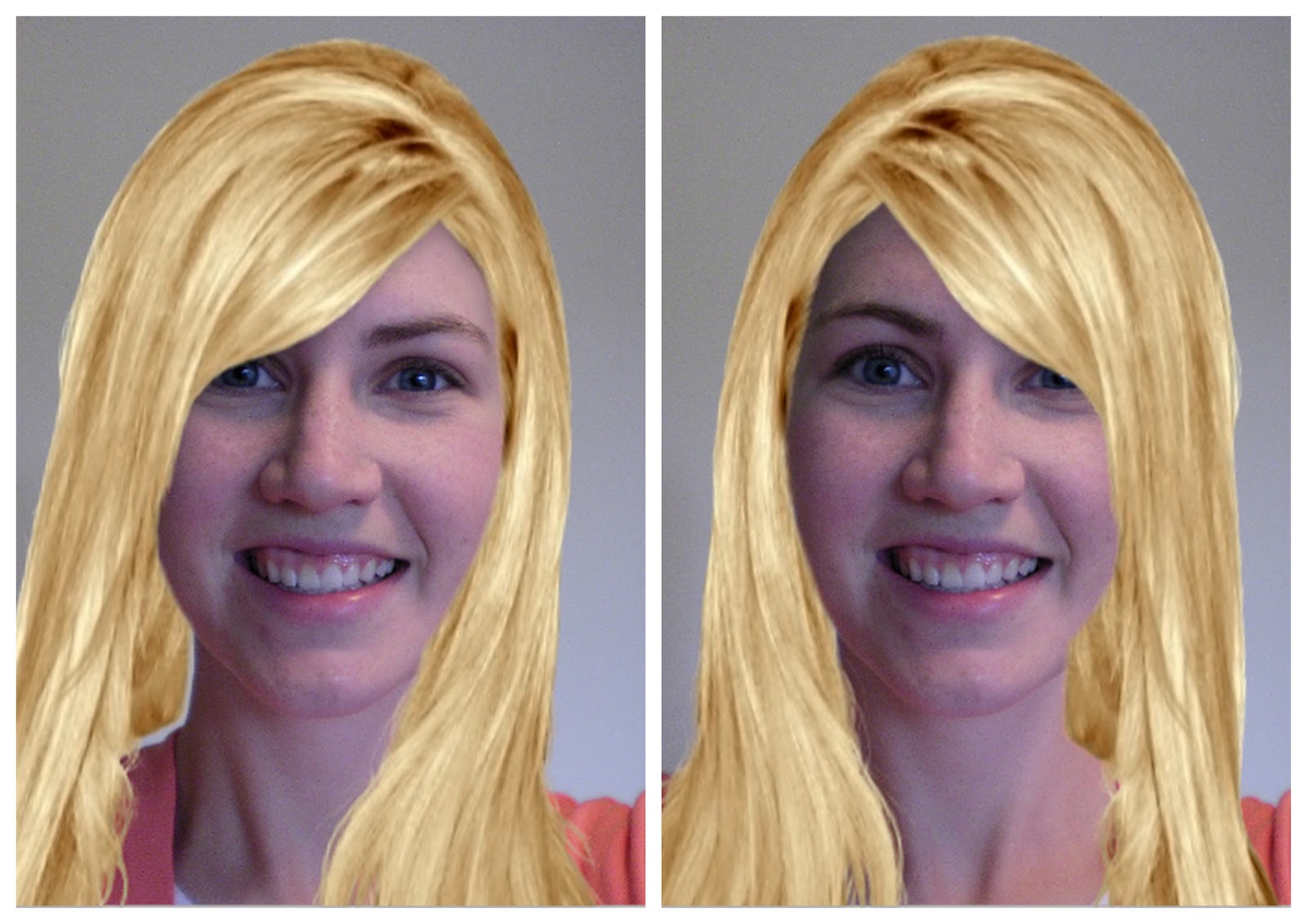 This initial selection and refining took less than ten minutes for each site, and then I was ready to try out those hairstyles! All it takes is just one click to put the style on your head. You can then adjust the width/height of the style to fit your face shape and head size best and select a color that is closest to you natural color (or the color that you want to color your hair).
