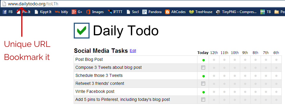 One of the cool things about DailyToDo is you don’t have to sign up for anything. Instead, you are given a unique URL for your task list. Simply bookmark this URL and keep it open in your web browser throughout the day.