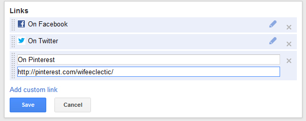 In the Links section, you can add links to whatever you want. To keep things branded, and to keep the loop of social media alive, I added the links to my Facebook, Twitter and Pinterest pages. Now, a new visitor to my page sees that not only do I exist, but I’m actively engaged with social media.