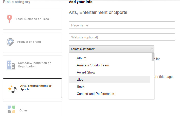 Now you have the option of selecting the type of page you’re creating. For your blog, select Arts, Entertainment or Sports. In the info area, enter the following information: