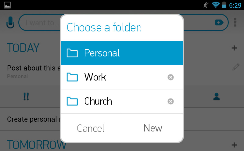 Speaking of personal and work, Any.Do recognizes you have different areas of your life, so it allows you to create separate folders in which you can store to-do items. You can even change the view from timeline to folder view, if that’s better for you.
