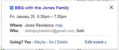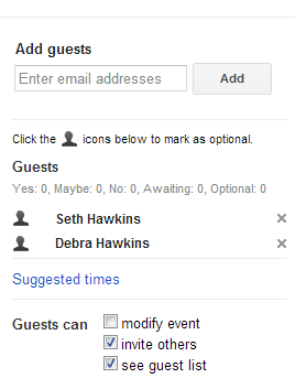 After filling out the date, time, location and description, I can add guests (in this case, my wife). This is done on the right side of the form in the add guests field. I simply type in her e-mail address and her name appears below. I can add other guests the same way.