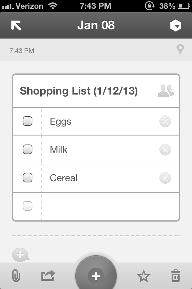 One of my favorite things is the checklist. This is perfect for shopping lists, honey-do lists or anything else. Anybody in the shared space can contribute to the list, which increases responsibility and the likelihood of something being done. Somehow, I don’t resent the honey-do list as much when it appears in digital form. I said: as much. Don’t get too excited.