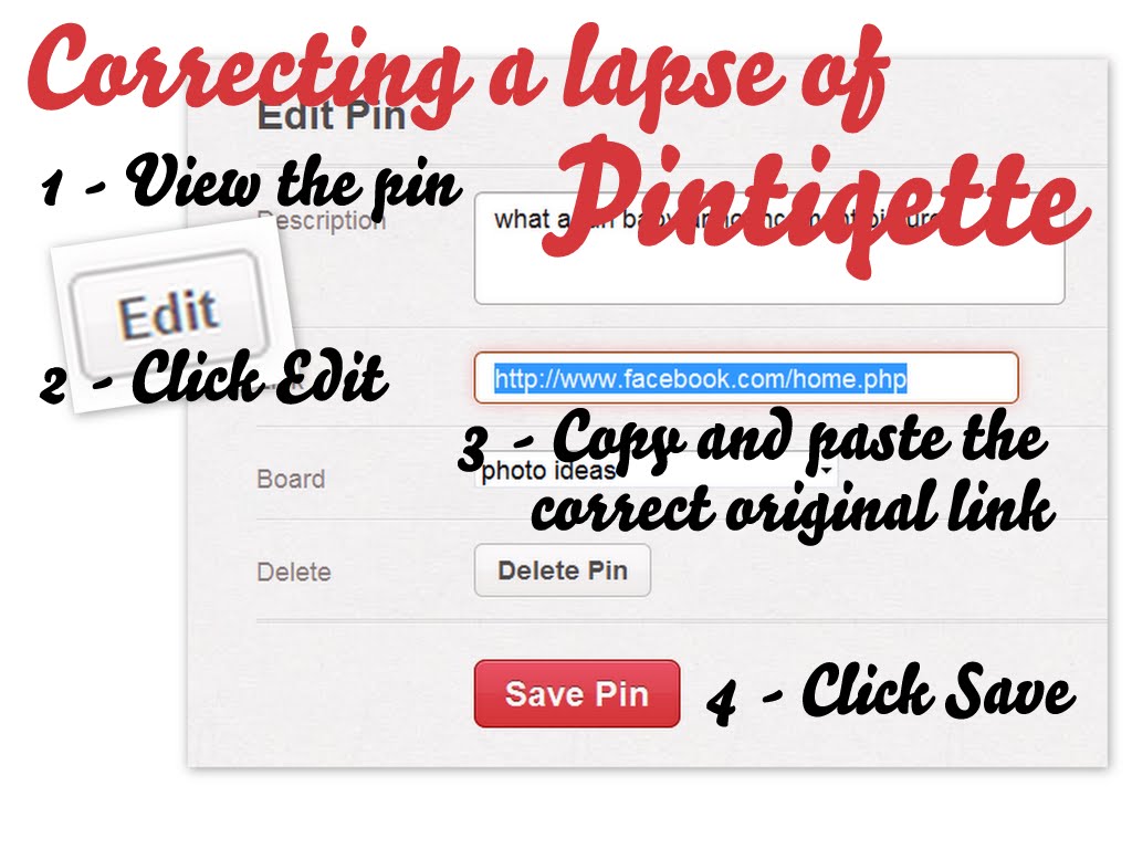 And what if you are (accidentally, of course) the impolite pinner? It’s easy to correct the pin to show the correct, original, permalinked source. This actually happened to me just last week, with a photo I had pinned from Facebook without noticing that the link wasn’t correct. π